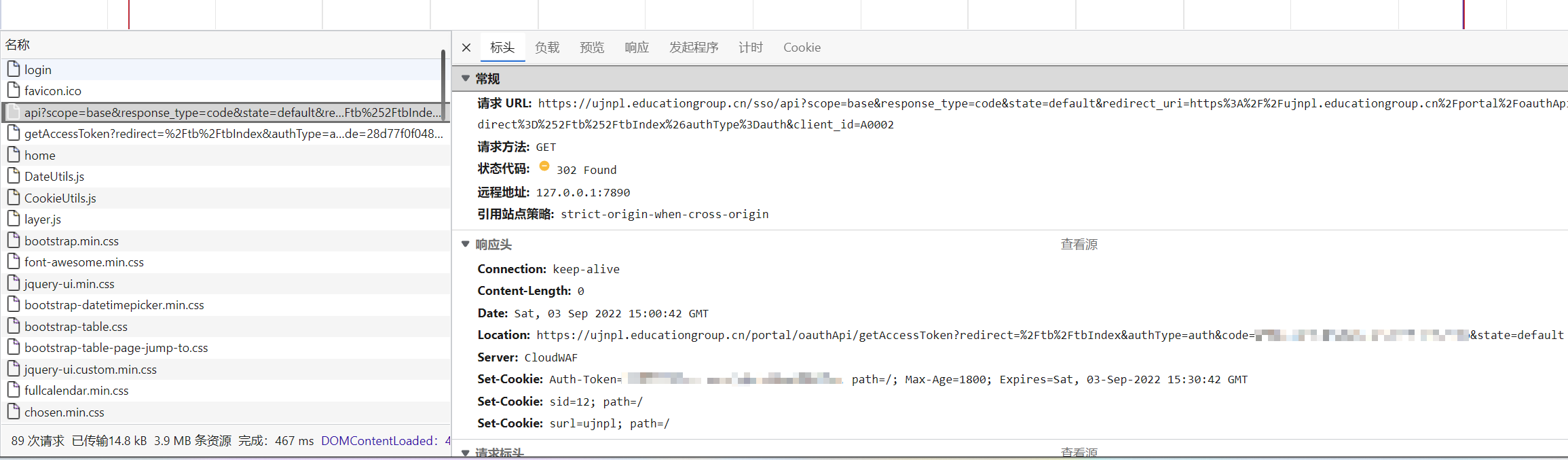 到了 getAccessToken 接口,这里进行了大量的 Cookie 设置操作,并最终 302 到了门户首页,完成了整个登录流程。