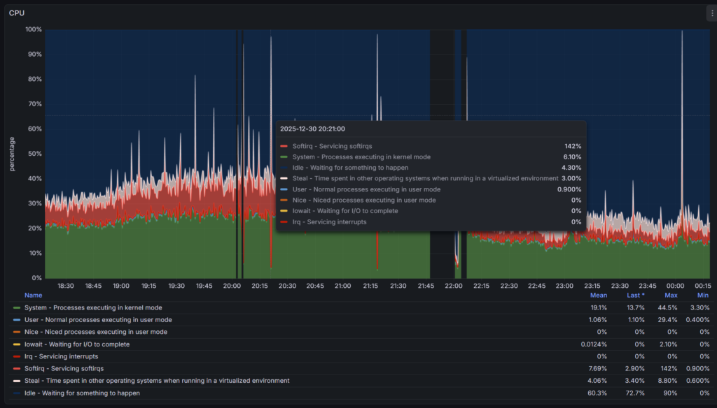 攻击时单机每秒请求数从平时的 ~2000req/s 飞涨到超过 5000req/s,然而又因为 Trunker 崩溃下线,大量 CloudFlare 的回源 TCP 连接卡在 BuyVM 设备上,CPU 中断暴涨起飞并最终引发 BuyVM 一起宕机。