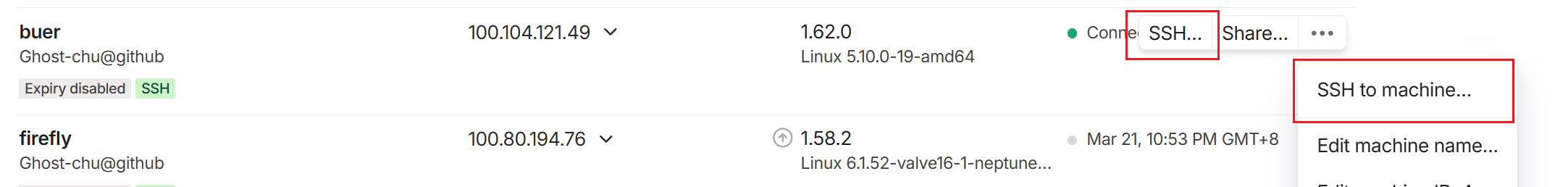 启用后回到 Machine 界面,支持 Tailscale SSH 的机器会有绿色的 SSH 标签显示。